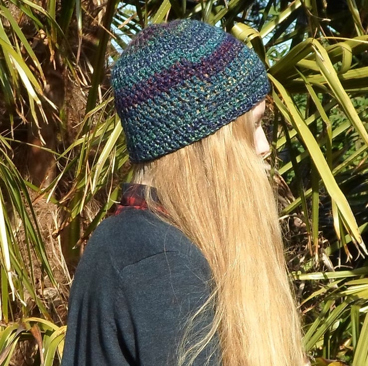 This crochet hat is made from thick variegated acrylic yarn. The colours are in the dark range of turquoise, mallard, rust and grey with some navy blue and brown.