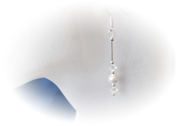 These beautiful hand made slim Bridal earrings feature White 5mm Pearls with toning Crystals from the world renowned crystal manufacturer in Austria. These pretty crystals are between clear & those which have a heavier rainbow (AB) finish, so they're really lovely with more sparkle than the clear ones.