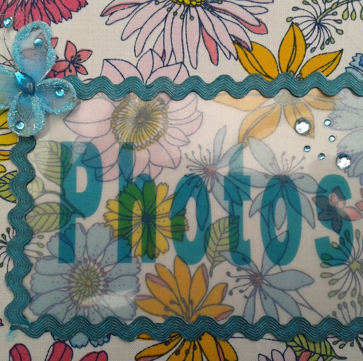 The front of the album has the word Photos and is embellished with pale blue coordinating trim, a pretty organza butterfly and acrylic gems.