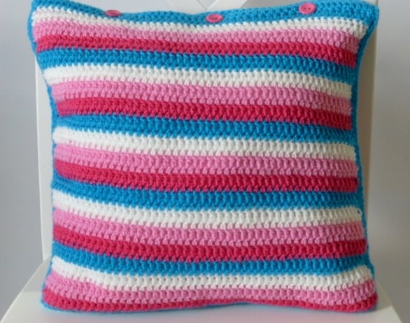 A crocheted cushion cover handmade in pretty shades of turquoise, pink and white.