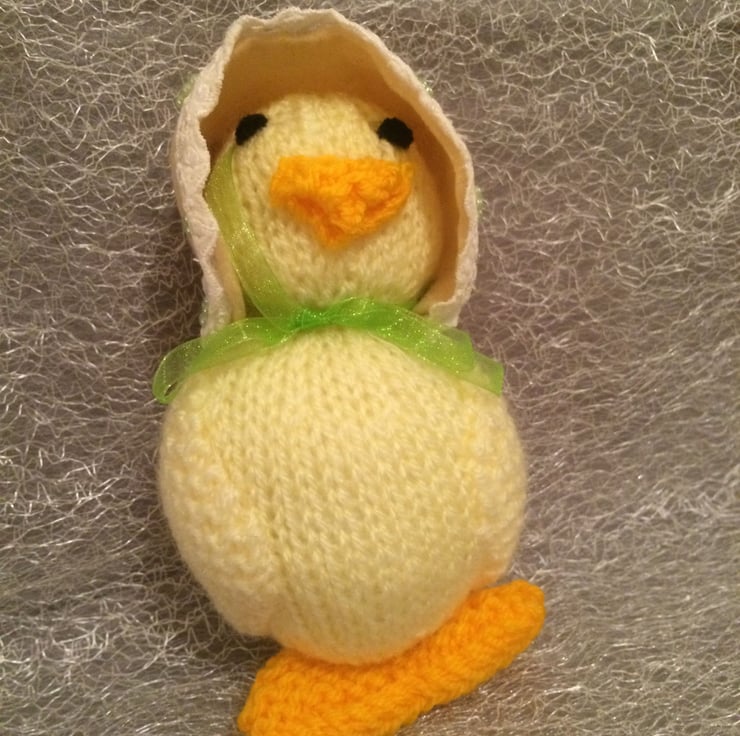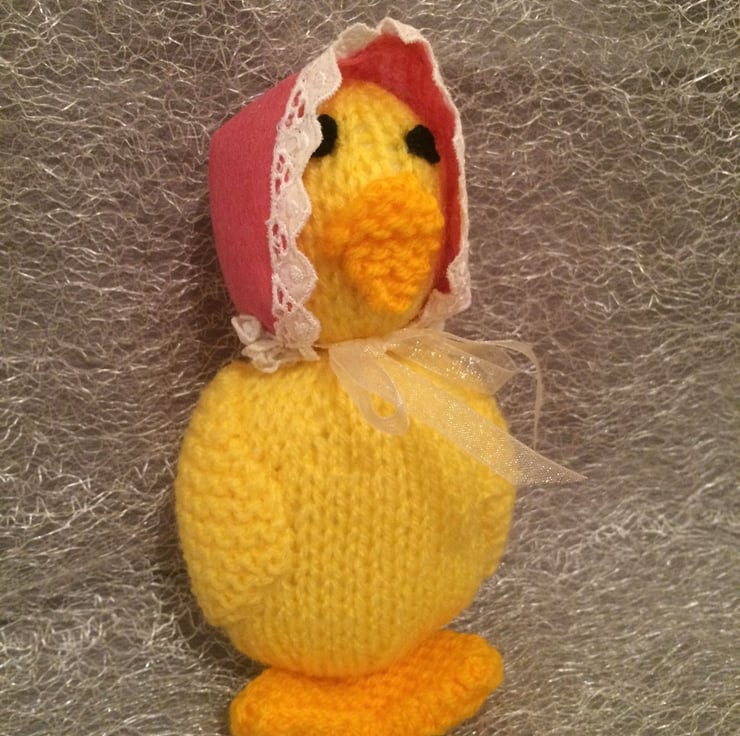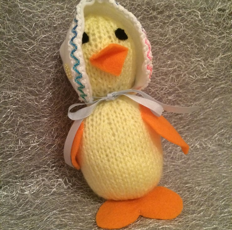 Pretty little decorative crocheted knitted Easter Chick with bonnet. Stands 17cm tall.