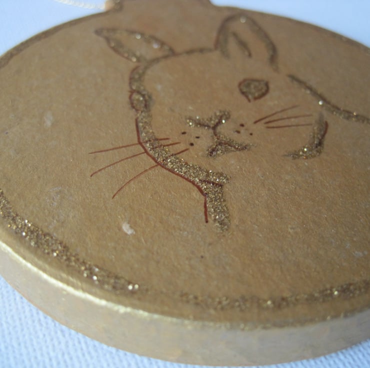 Painted in metallic gold acrylic paint, the rabbit has been hand drawn, then outlined in glitter glue with pen detail.