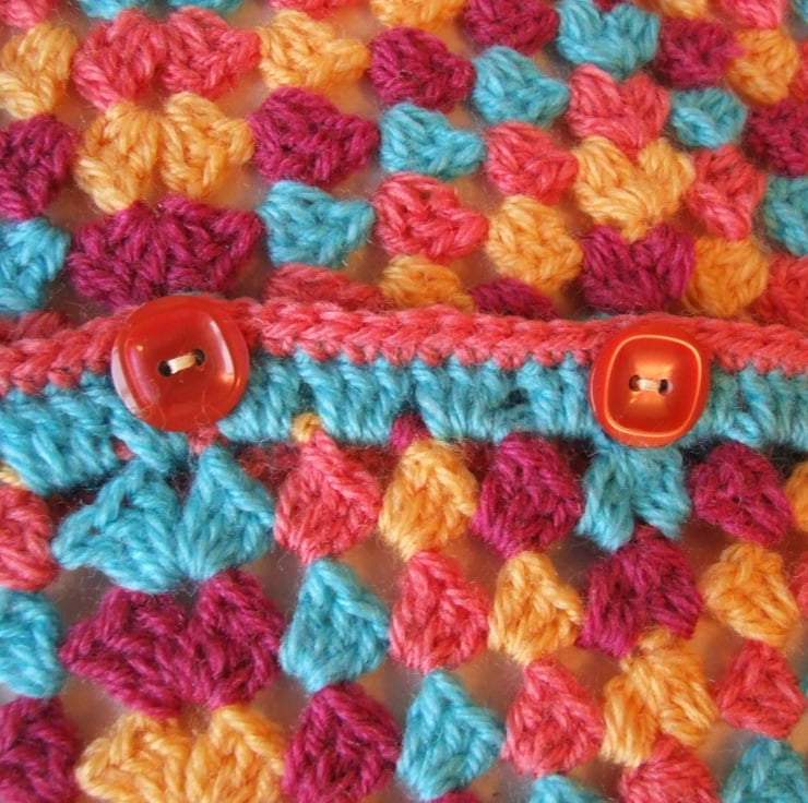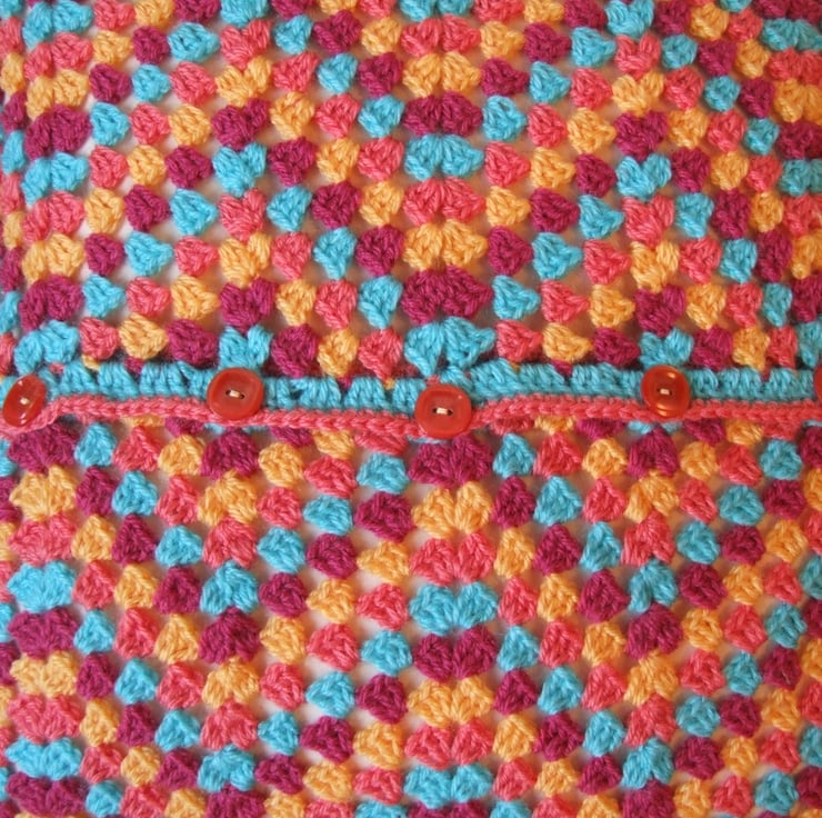 It is fastened at the back by five rich peach, vintage buttons to match the peach edging on the sides.