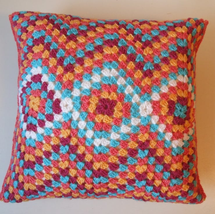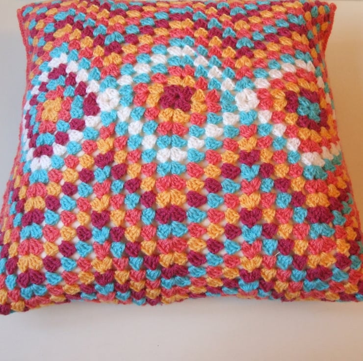 A ripple, crochet cushion cover handmade in five vibrant colours. Inspired by the shades of a Moroccan bazaar in white, turquoise blue, yellow, peach and fuchsia. The colours are arranged in a geometric, zigzag pattern that would enhance any home. Ripple pattern crochet is eye catching.