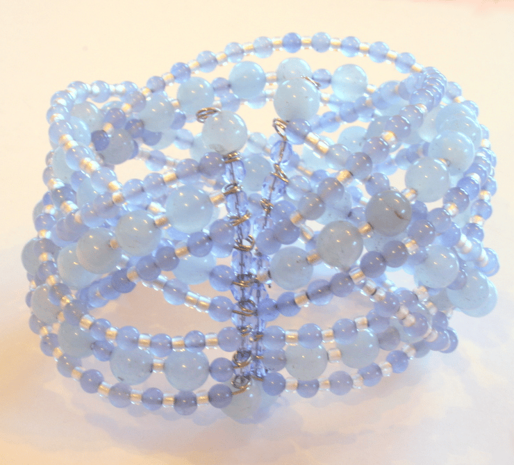 This beautiful, eye catching cuff is made from round blue dyed jade beads and frosted silver seed beads. The cuff is constructed from 9 strips of memory wire which have been braided together. Three strands of memory wire create each of the three sections of the braid. Each of these sections has a subtly different pattern of beads.