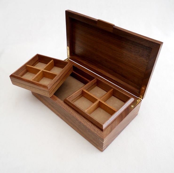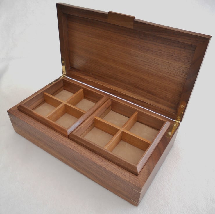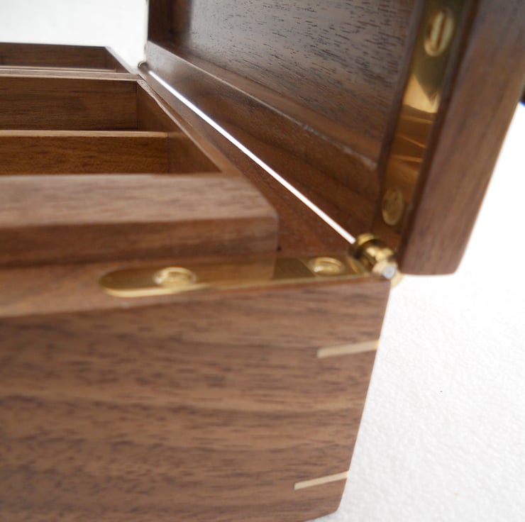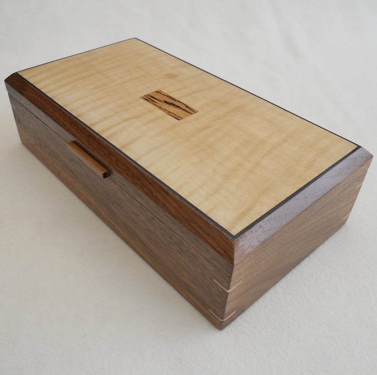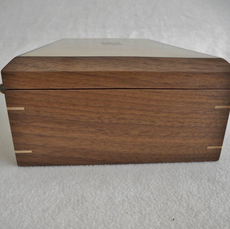 A solid walnut jewellery box, the top being veneered with figured sycamore, with a solid spalted beech centrepiece. As a feature and for added strength I have inserted sycamore keys to the four corners of the box.