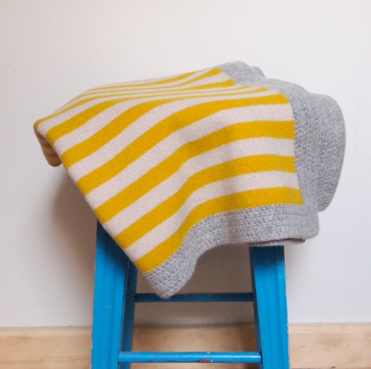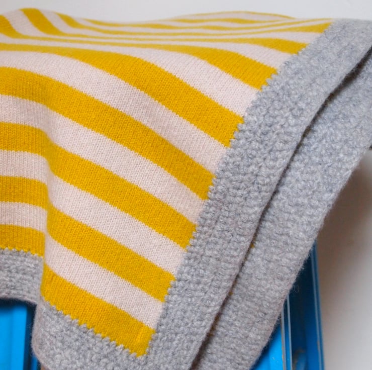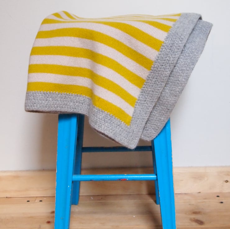 This blanket is made with 100% soft lambswool that I've made on my hand powered knitting machine, I then hand crochet the grey edging.