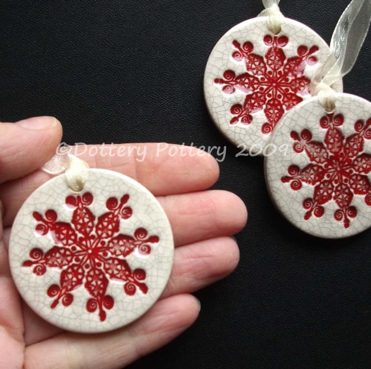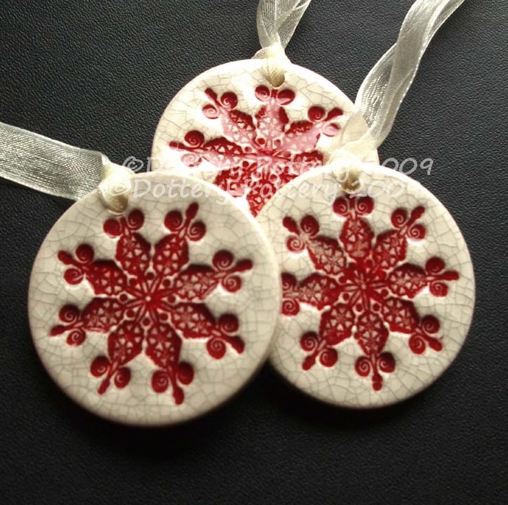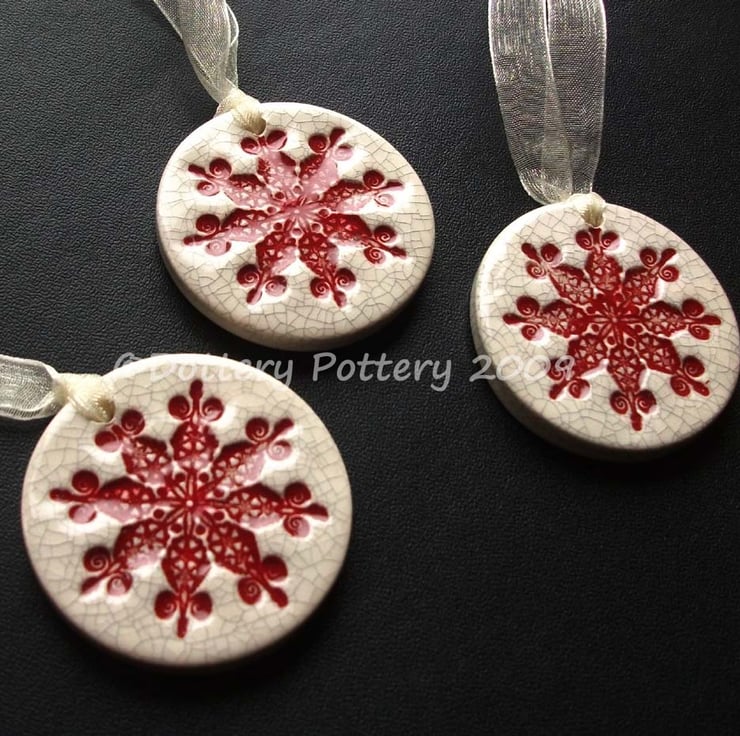 These little snowflake decorations are made from white earthenware clay - stamped with a snowflake image and fired.