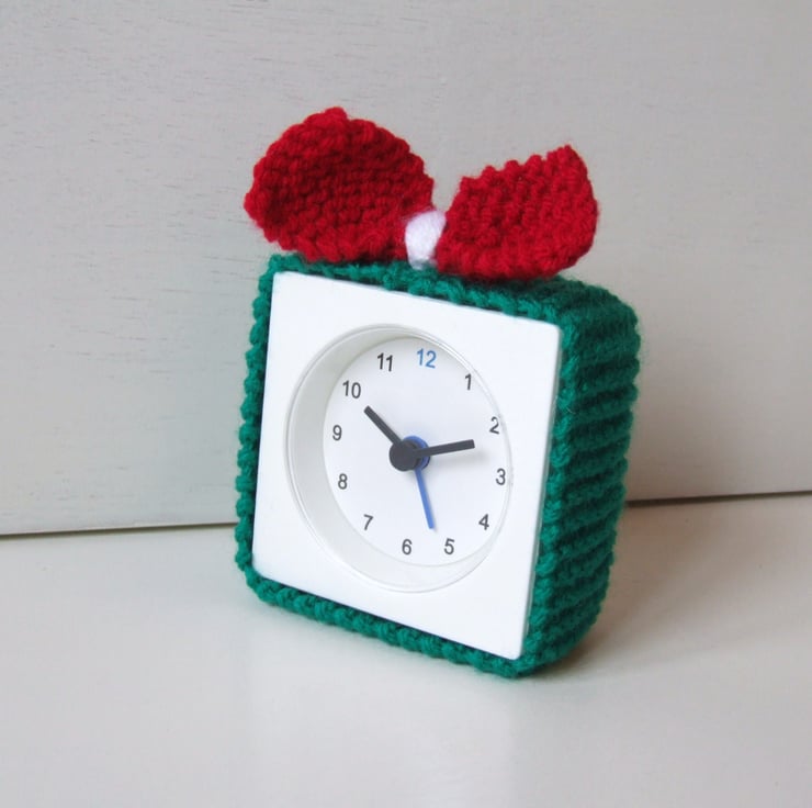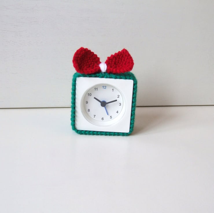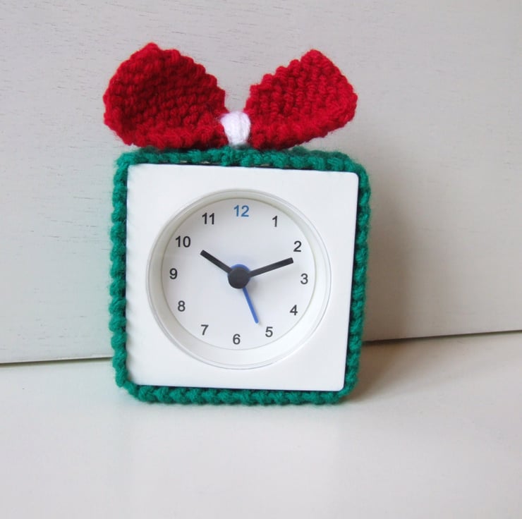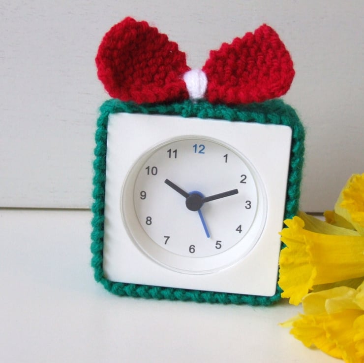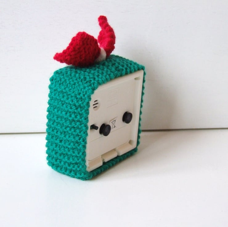 An alarm clock cover for your early wake up call. This cosy for a basic alarm clock is just the thing to ring in the seasons. Wake up to great start with a hand knitted cover with a little bow to add the cute factor.