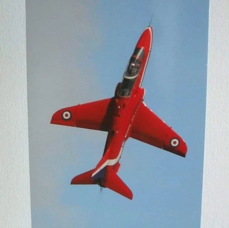 6" x 4" (150mm. x 100mm.) photo of a single Red Arrow in a vertical climb mounted on white textured card with a blank inner. An envelope is also provided. Same photo in either an acrylic coaster or an acrylic fridge magnet is included, see the variations, as per the GB Hot Air Balloon sets.