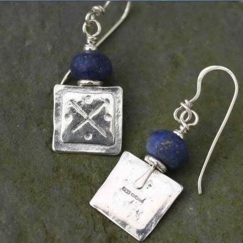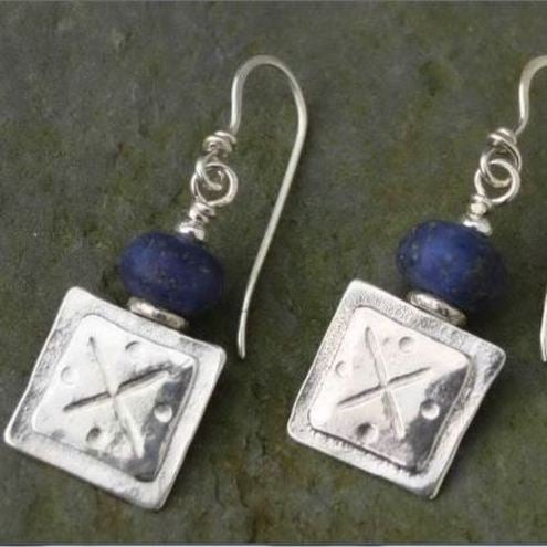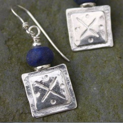 Small sterling silver squares are fused hammered and burnished to a subtle shine, they are topped with plump Lapis Lazuli roundell beads that I have left matte to contrast with and compliment the textured bright silver.