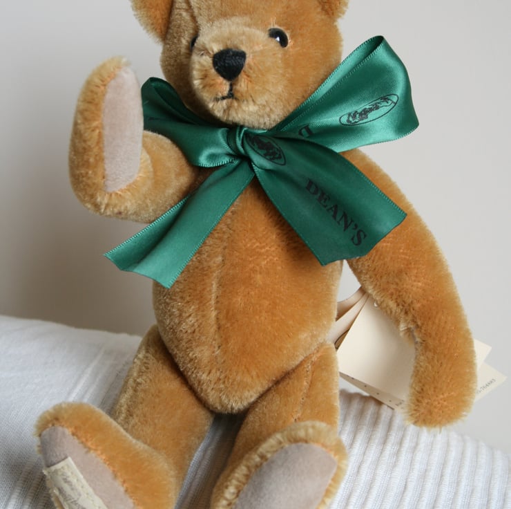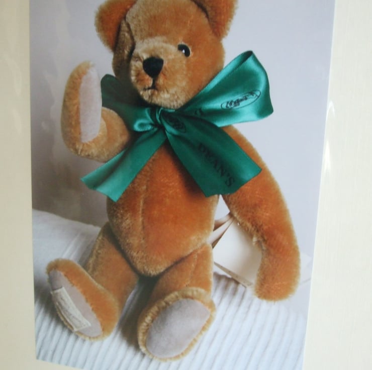 6" x 4" (150mm. x 100mm.) photo of a Dean's Teddy Bear wearing a green bow tie. This photo is mounted portrait on a cream textured card. It has a plain inner left blank for your own personal message. An envelope is also provided.