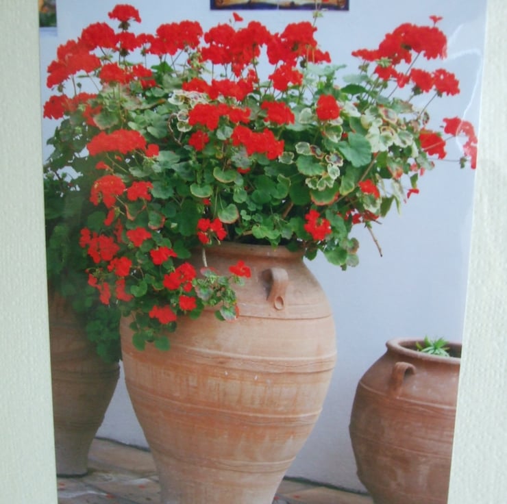 6" x 4" (150mm. x 100mm.) photo of a large terracotta urn full of bright red Geraniums in the Med. Bihome at the Eden Project. This photo is mounted portrait on cream textured card with a blank inner. An envelope is included.
