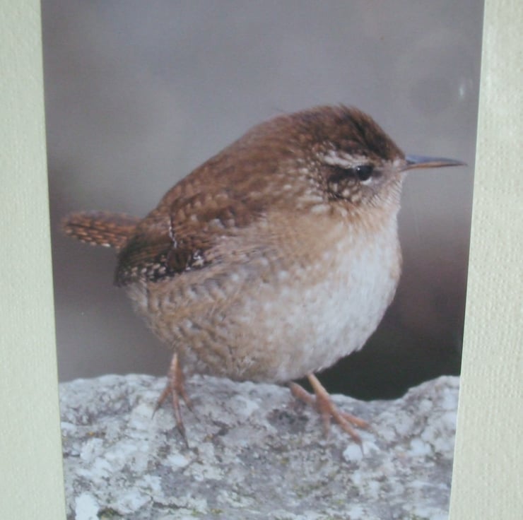6" x 4" (150mm. x 100mm.) portrait photo of a jenny wren on a rock, on Swanpool Beach. This photo is on cream textured card with a blank inner. An envelope is also provided.