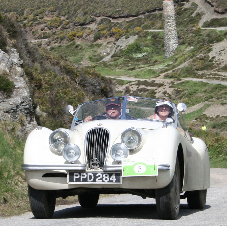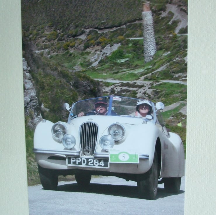 6" x 4" (150mm. x 100mm.) portrait photo of a Jaguar XK120 on the Blue Hills Section of the Cape to Cape Rally. This photo is mounted on cream textured card, with a plain inner, left blank for your own personal message. An envelope is also provided.