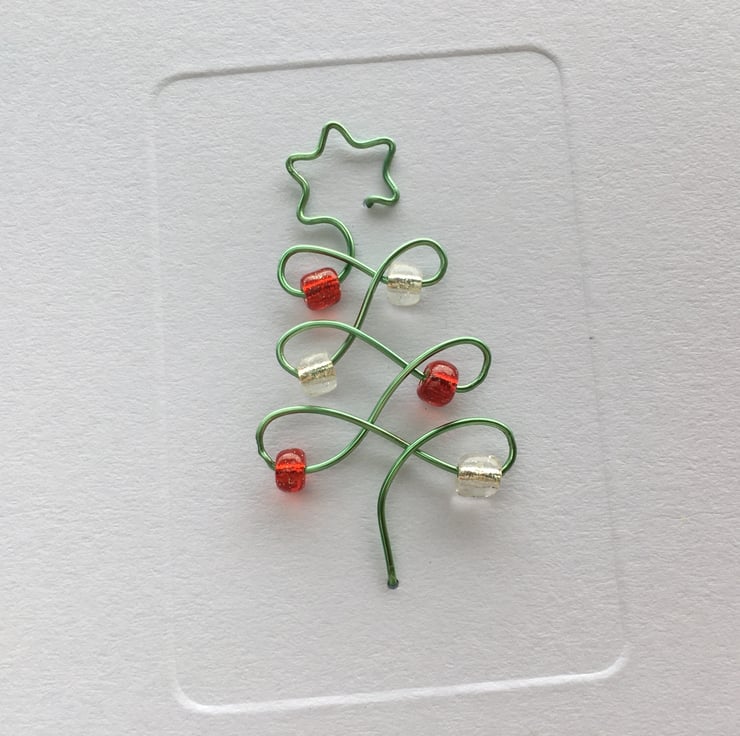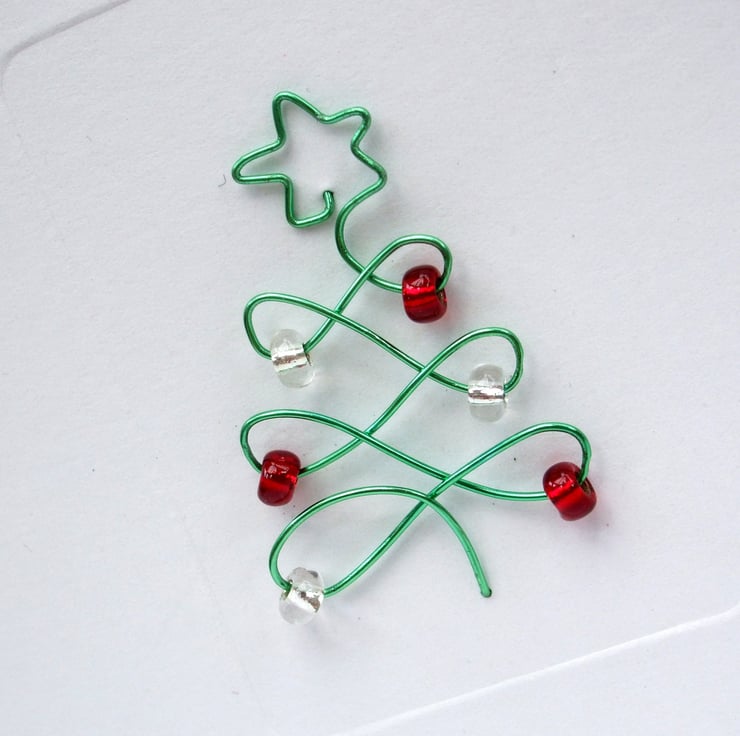 This simply stunning Christmas card consists of a delicately twisted green wire tree with a star on top and threaded red and silver baubles in the form of beads attached to a quality white card.