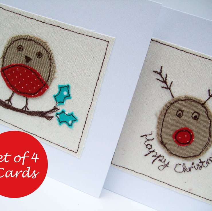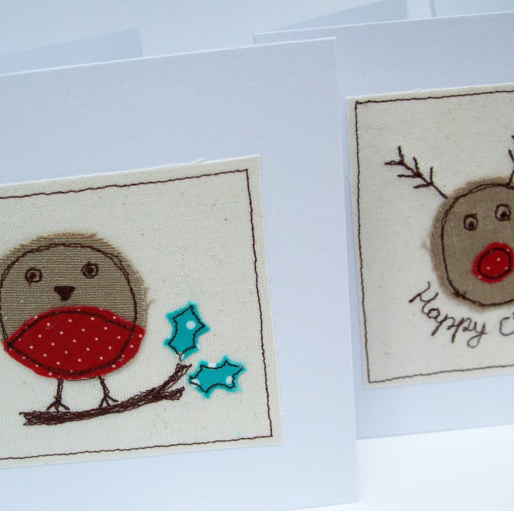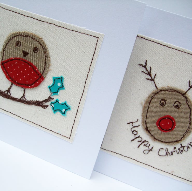 This cute little christmas robin and fun rudolph the red nosed reindeer have been machine embroidered onto the cards making lovely handmade cards to give to someone special at Christmas!
