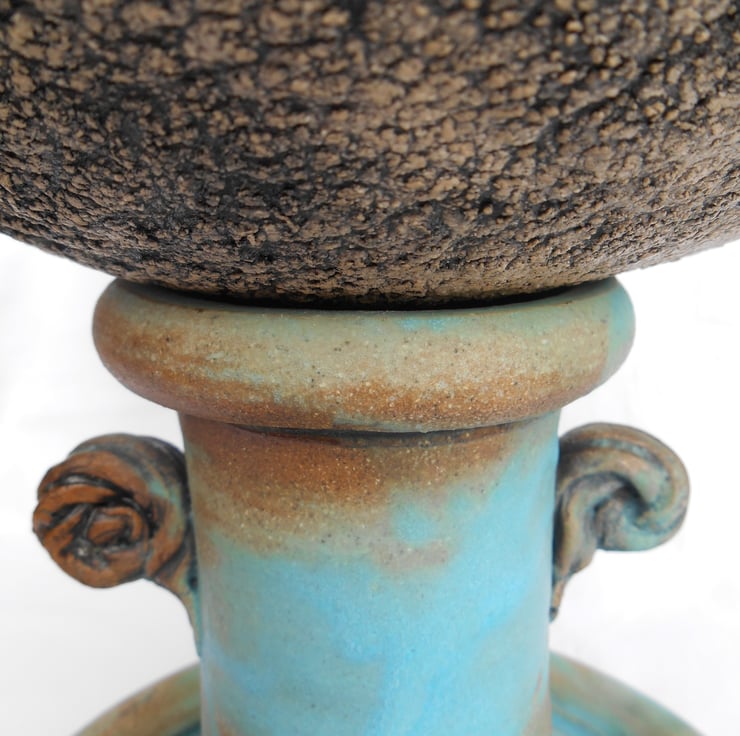 Turquoise glazed wheel thrown stoneware base with pressmoulded bowl components joined in harmony. Base 22cm high, bowl 20cm high.
