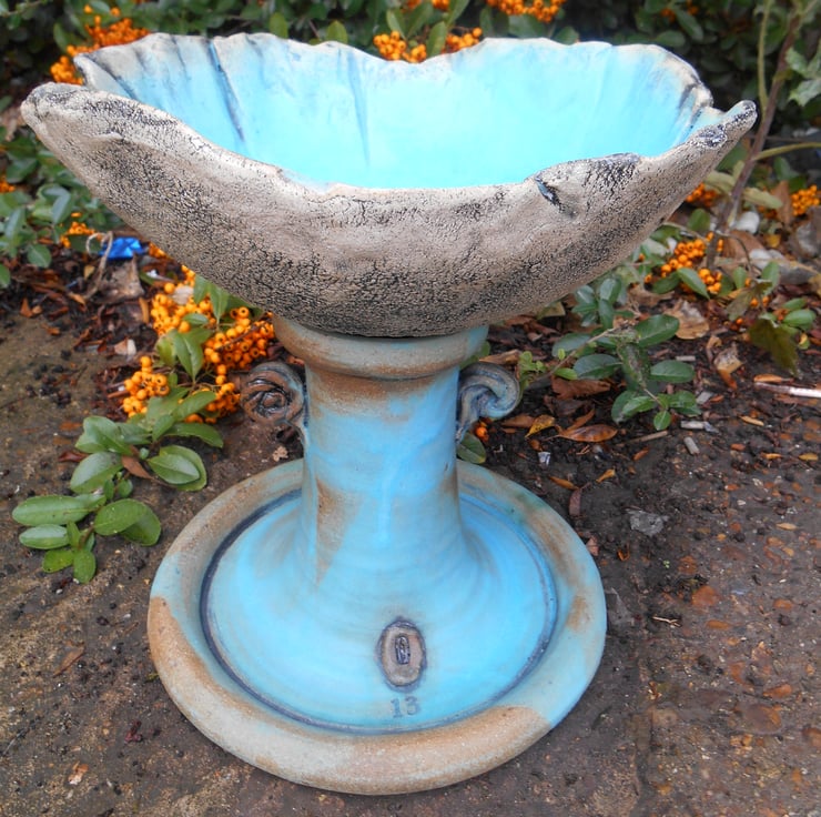 This is another version of my new series of one off bowl top textural birdbaths. I recently exhibited old and new Birdbath and Garden Ceramics in King Henry's Walk Woodland garden, which was magical, and inspired me to create new exciting designs.