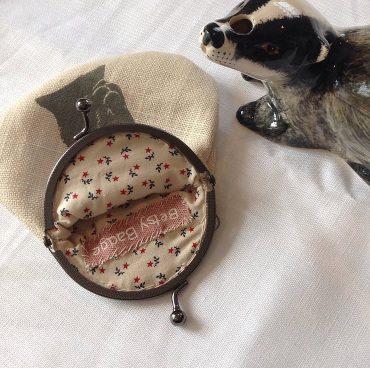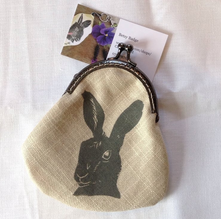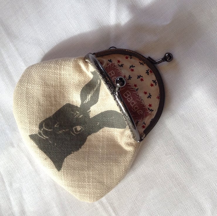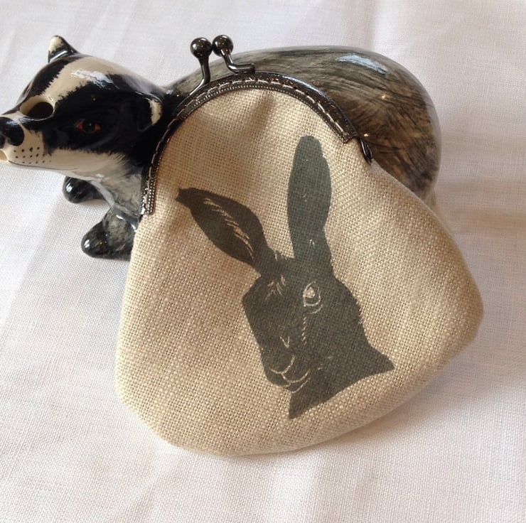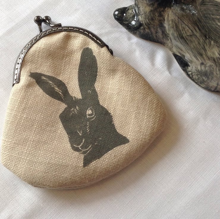 This beautiful little purse has been hand printed with a gorgeous grey hare on a beige linen mix fabric.