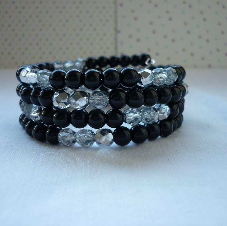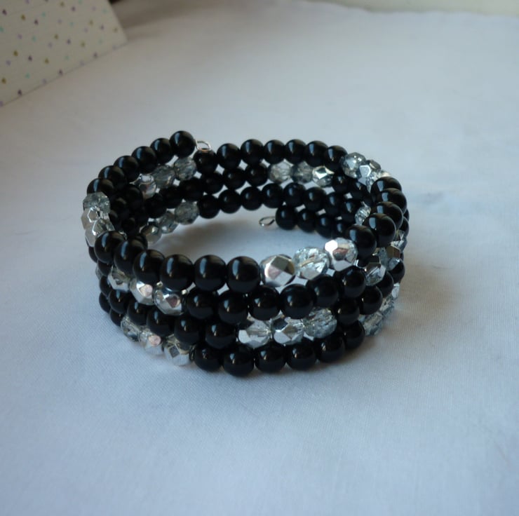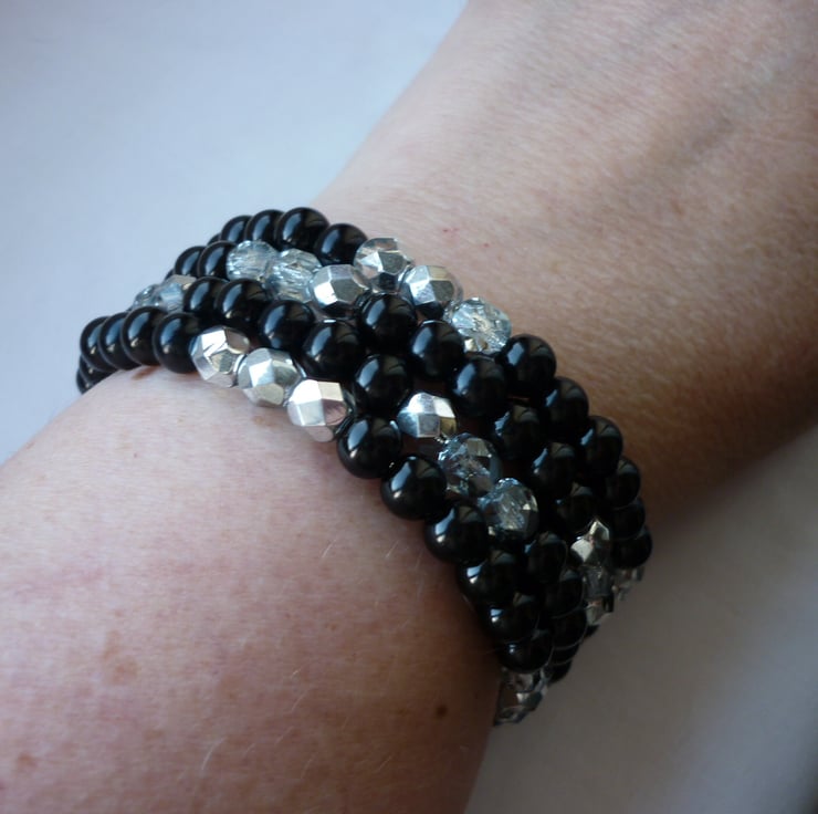 THE BRACELET HAS BEEN MADE WITH 6MM GLASS PEARLS IN BLACK ALONG WITH FACETED GLASS CZECH BEADS IN TWO TONE SILVER AND CRYSTAL, AND ALL STRUNG ONTO SILVER PLATED MEMORY WIRE, WHICH ALLOWS THE BRACELET TO WRAP AROUND THE WRIST SO NO CLOSURE CLASP IS NEEDED. THE BRACELET IS SO COMFORTABLE AND EASY TO WEAR.