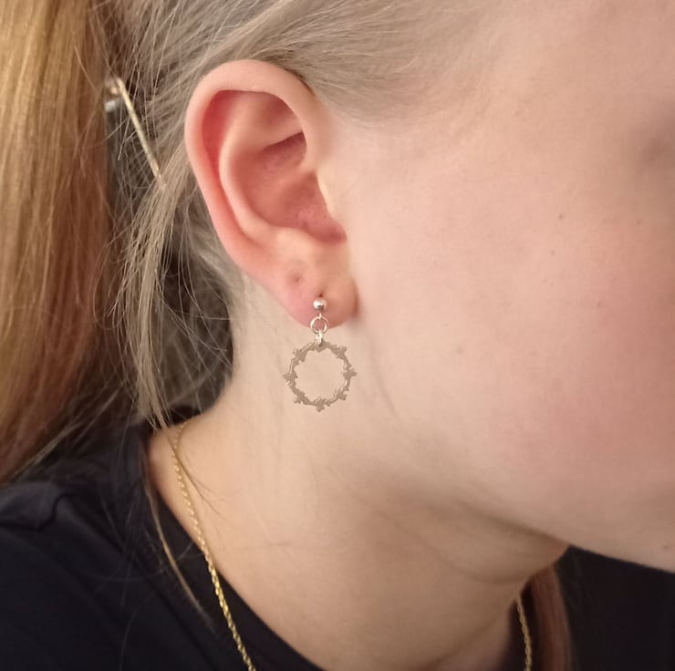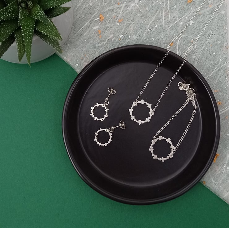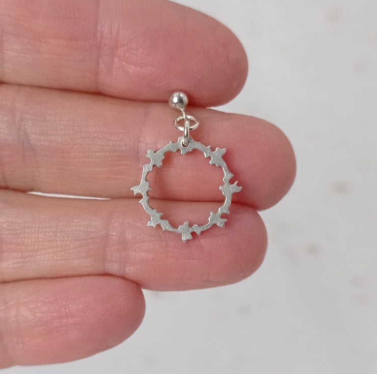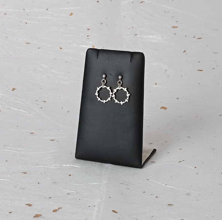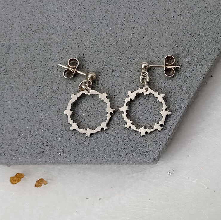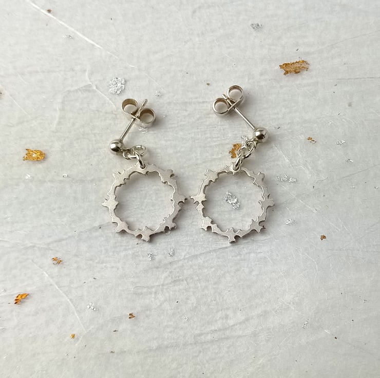 I have created these earrings by cutting by hand from sterling silver unique circle shapes. After filing and finishing, they were attached to sterling silver ear studs. They have been designed by myself and is part of a small collection of matching earrings and bracelet.