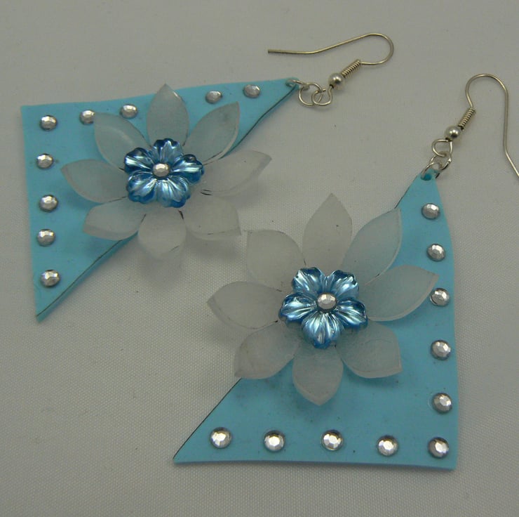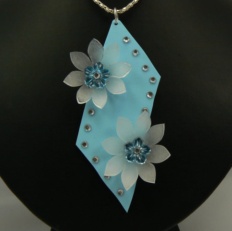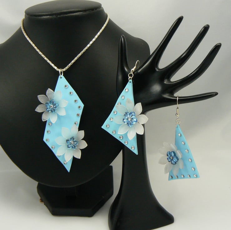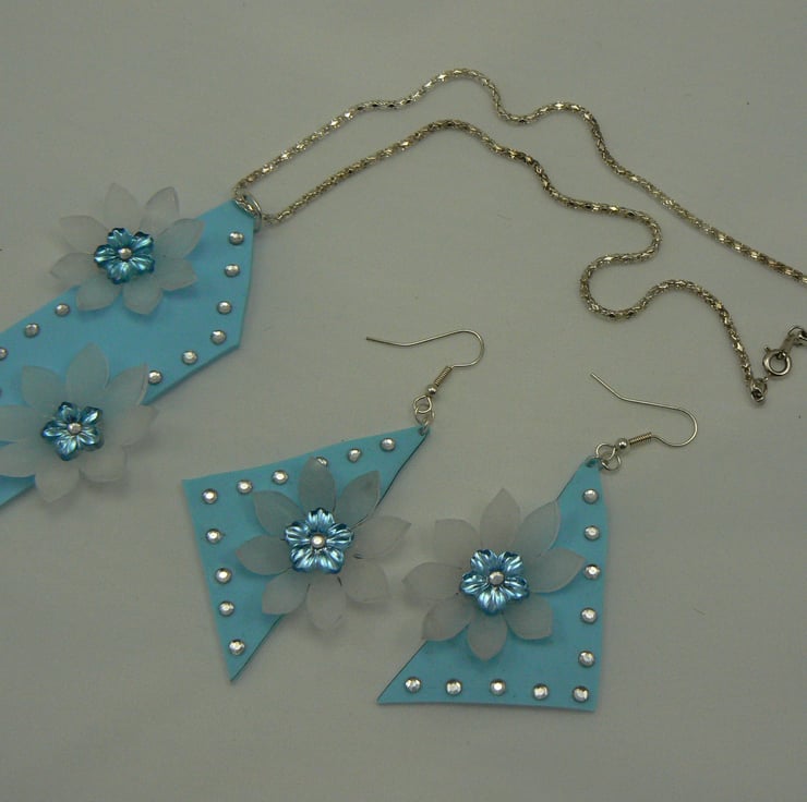 Pretty blue that and white (frosted) necklace and earring set on silver colour chain, that I have made from shrink plastic (thin sheets of plastic that when heated shrinks - a lot! and gets thicker) . I first cut out the shape that I have drawn and then heat it up and watch it get smalller at the same time moulding the shape of the petals before it sets hard then layer the design and glue together. I then added some rhinestones to add a bit of sparkle.