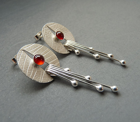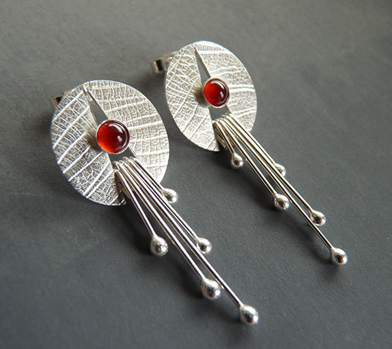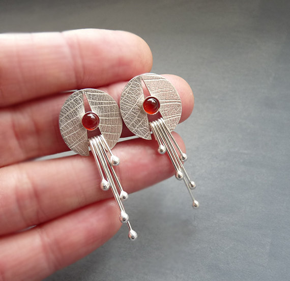 These beautiful post earrings with carnelian are entirely hand made in sterling silver. They have been textured and polished to a bright and shiny finish. Five sterling silver dangle " sticks" were accented with granulated balls . The earrings have sterling silver butterfly scrolls.