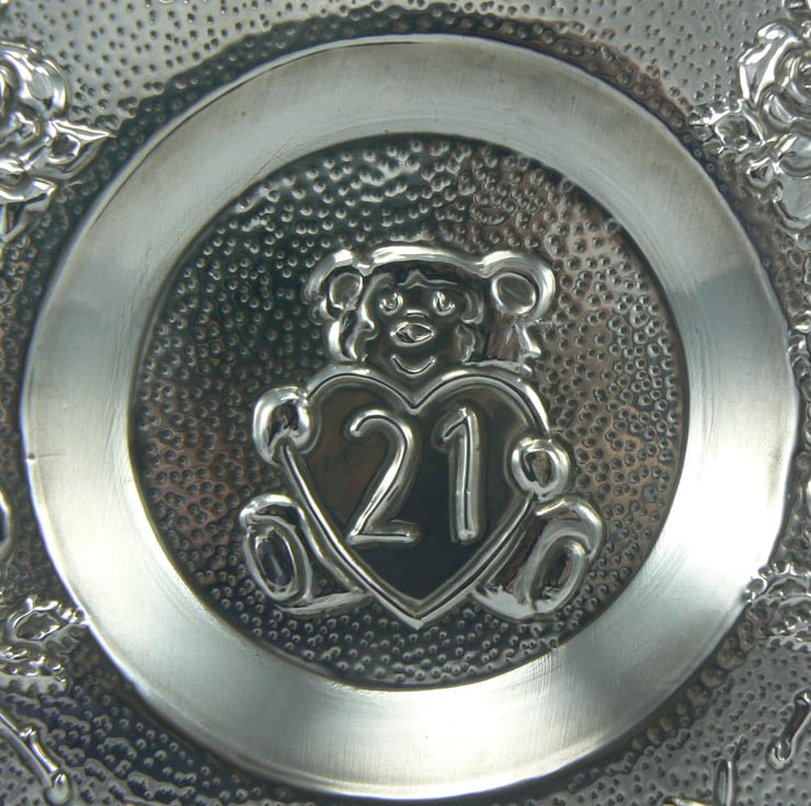 21st birthday pewter plate . To make this plate I draw my design on to the pewter which I then raise and define using a boxwood tool to stretch and mould the image. The raised design is then filled and mounted on to a base,then the background is worked further to give a textured look , patinated and finally polished. This pewter does not tarnish like silver but can be buffed up if necessary with a silver cloth of silver wadding.