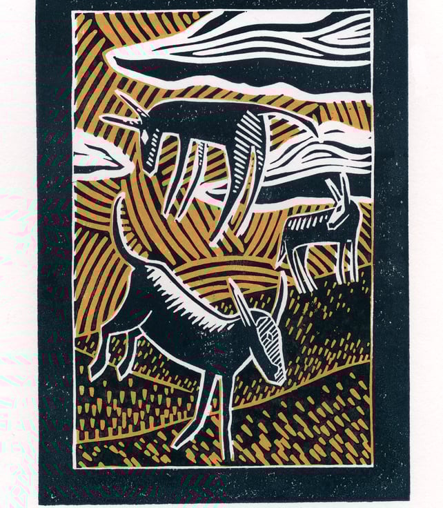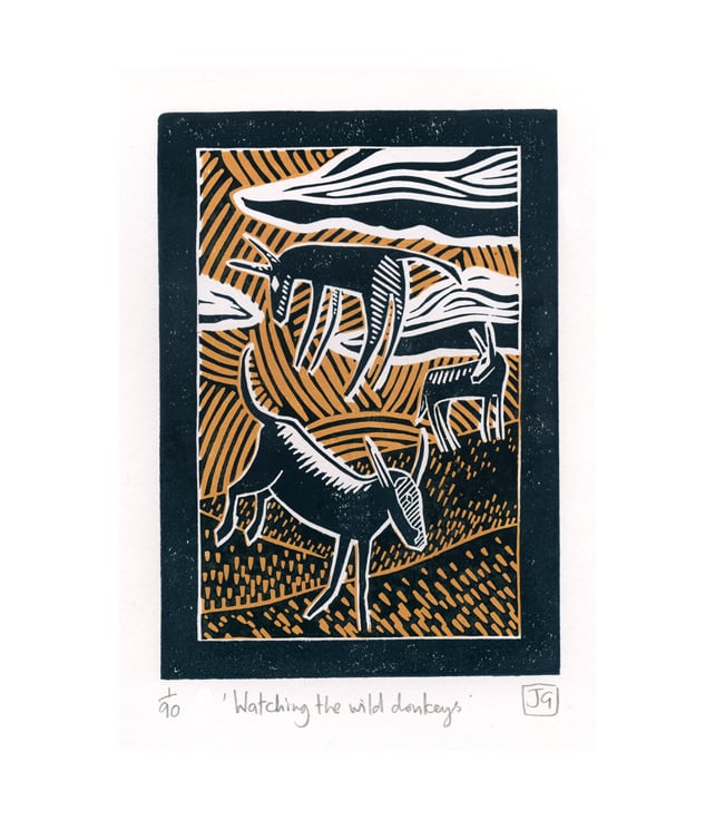 A 2-colour linocut print entitled 'Watching The Wild Donkeys'.
