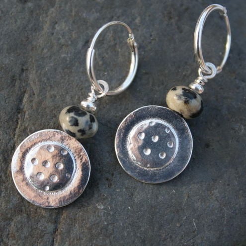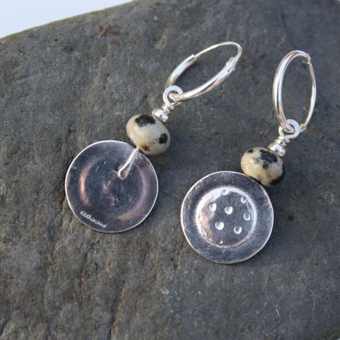 Here we have a pair of fun spotty sterling silver earrings, fused beaten and textured these ones are topped with a Dalmation Jasper bead.