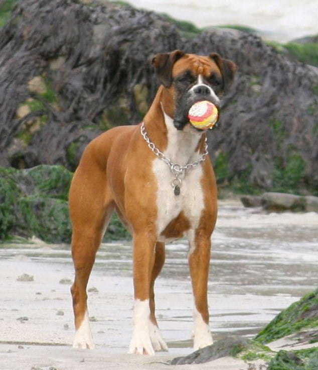6" x 4" (150mm. x 100mm.) photo of a Boxer dog on a beach. It is mounted portrait on cream textured card with a blank inner. An envelope is also included. The 3 photos shown are 1st. mounted on a card; 2nd. the actual photo used; 3rd. the original, that was enhanced, to a close up.