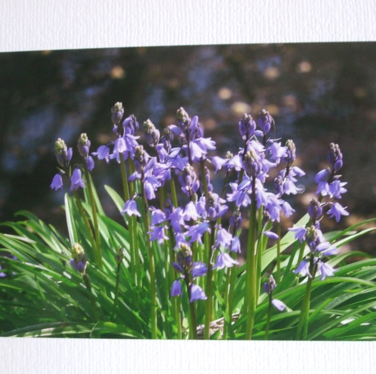 6" x 4" (150mm. x 100mm.) photo of a clump of Bluebells.This photo is mounted landscape on a white 'A' fold textured card with a plain inner left blank for your own personal message. An envelope is also included.