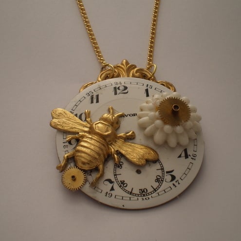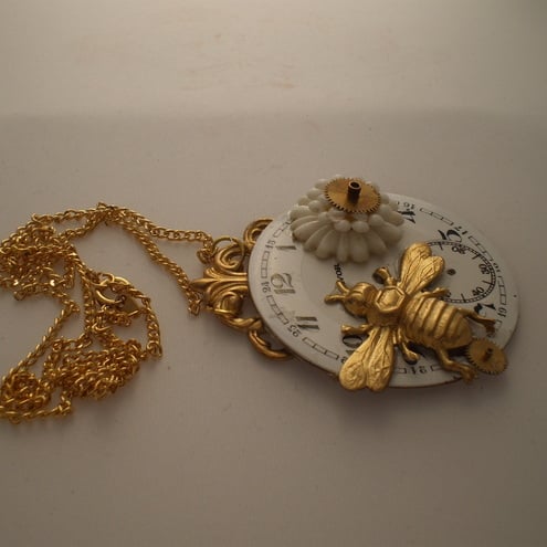 A fun and quirky Steampunk necklace. A golden bee has landed on a vintage ceramic watch face with lovely Gothic script, enticed by the flower, which is a 1950's lucite earring. Accented by two tiny cogs. Hung from an ornate filigree finding and a 18 inch goldtone chain. Measures 2.5 cms dia. Own something unique or to give as a gift for someone who loves the unusual.