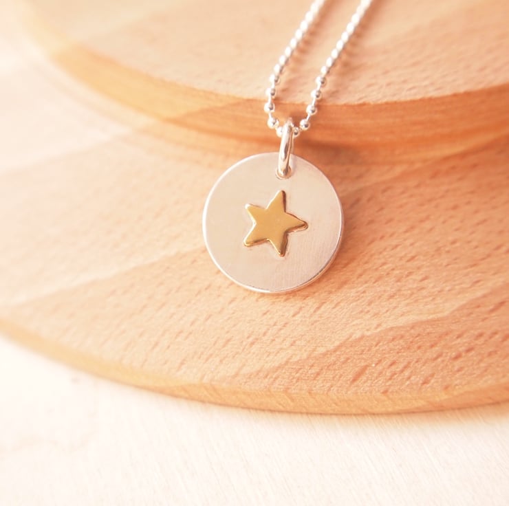 A simple silver disc pendant with a warm yellow metal star. A lovely subtle necklace suitable for everyday wear. It comes with a matching chain in a range of sizes for you to choose from ( if you are gifting and not sure - 18 inch is a good size for most!)