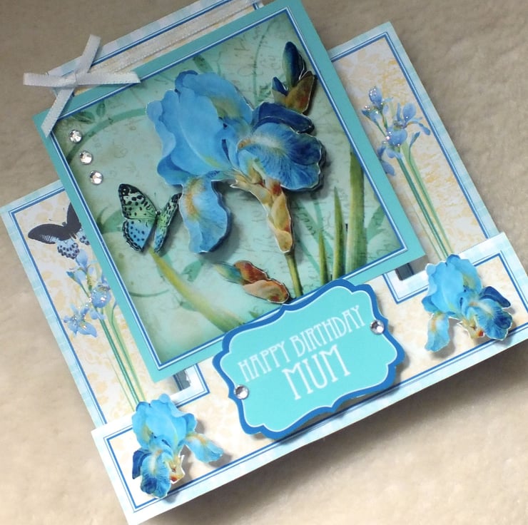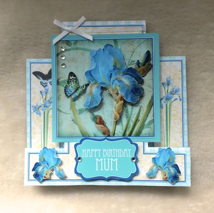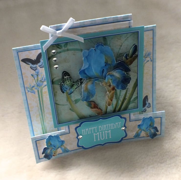 This is a very dainty handmade stepper card, approx. 5”x5”. The design uses pretty floral prints, which have been delicately decoupaged, and embellished with faux gems, glitter and a satin bow. Includes the sentiment ‘Happy Birthday’ inside.