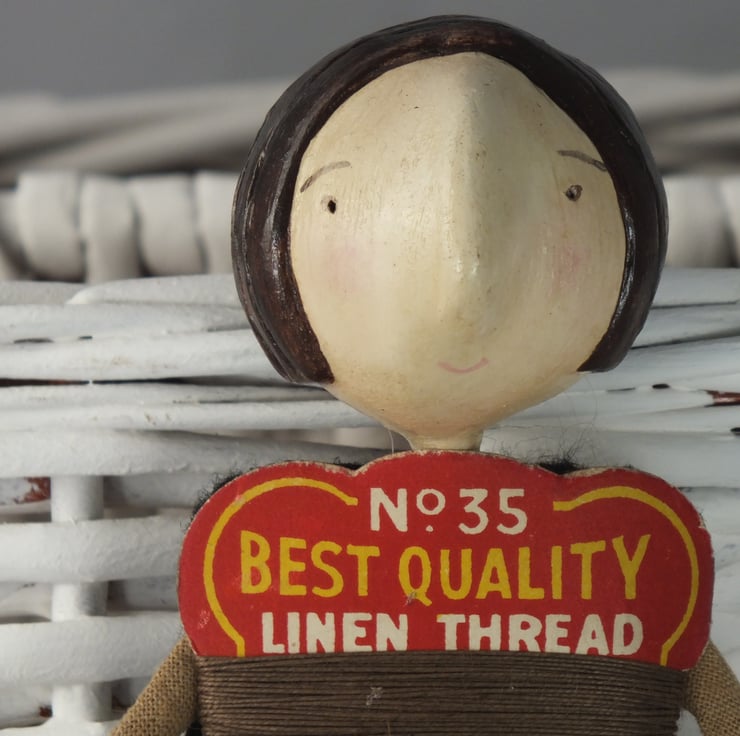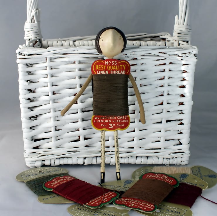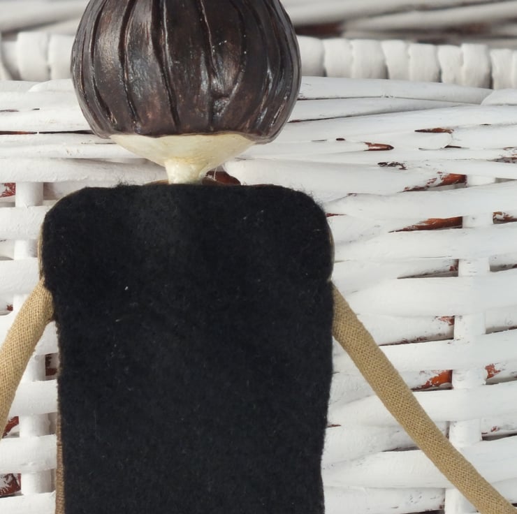The body of the doll is a vintage card of linen mending thread and is backed with two layers of black felt. The arms are wired coffee dyed linen (which can be bent ) and the legs are papier mache with little painted shoes. Her head is made from air dry clay ,painted with acrylics and then varnished.