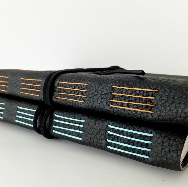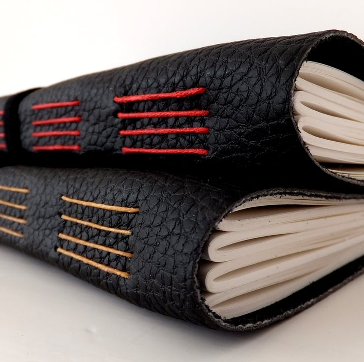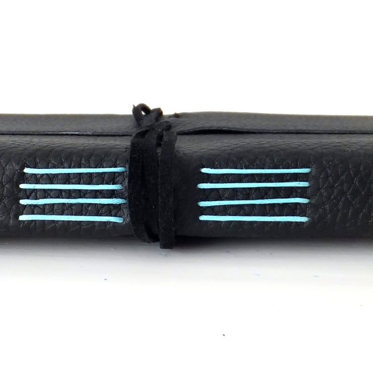 Hand sewn in a lovely decorative long stitch with TAN waxed linen thread - We also have one sewn in a TURQUOISE BLUE thread, RED thread - if you'd prefer a journal sewn in any of these other colours, please drop us a note to see if we still have it available.