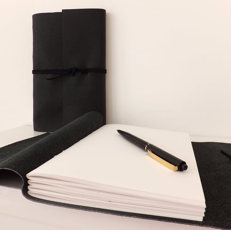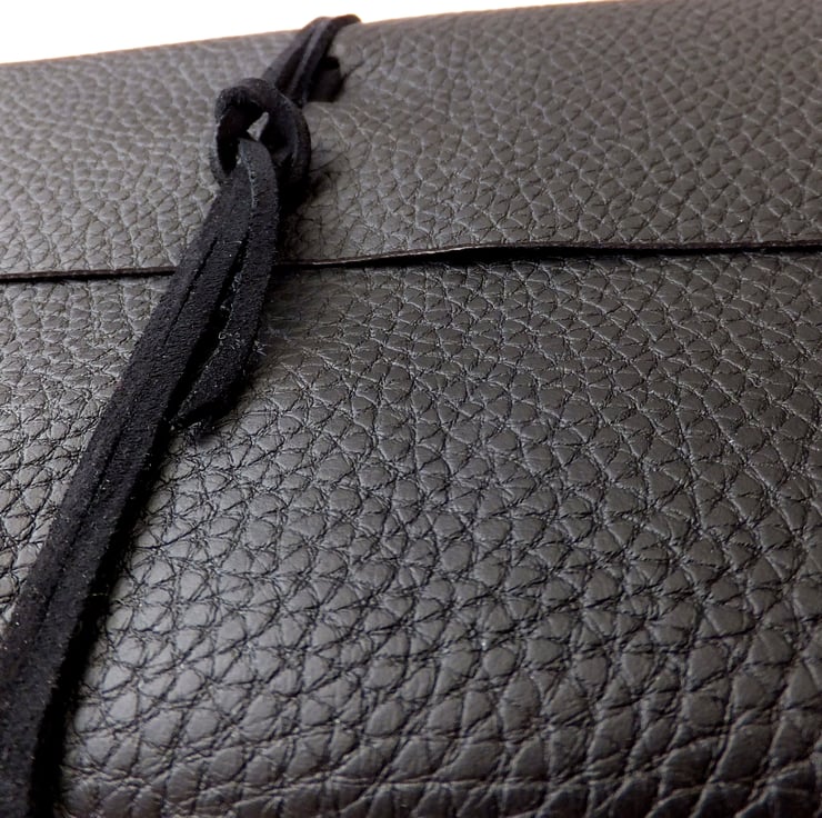 The lovely soft cover is made from black recycled leather. The cover wraps right around the journal and is tied with a matching black leather cord!