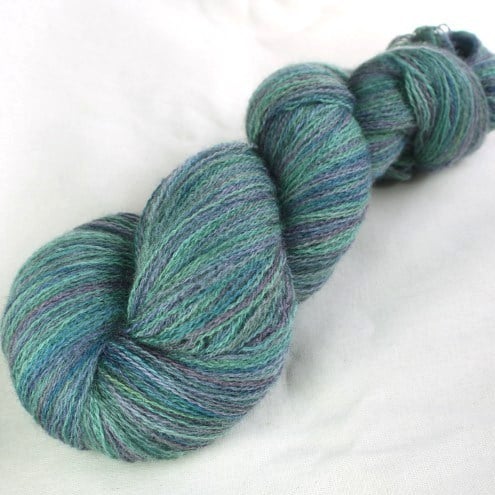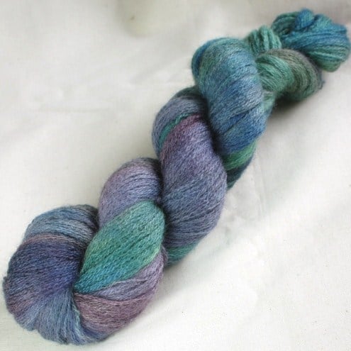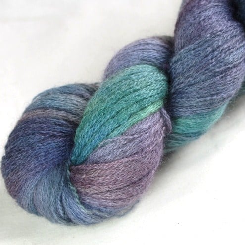 The many soft shades of foresty greens, teals and purples (sort of wisteria/plum/lavender shades) in this yarn make me think of