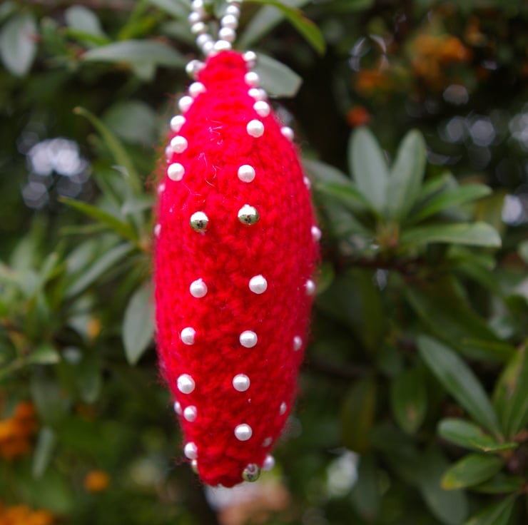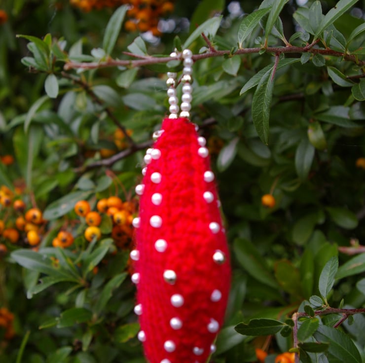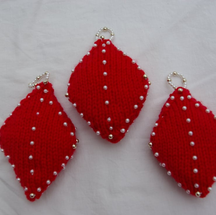 A trio of diamond shaped knitted Christmas Decorations hand knitted in Red. Each one is padded and decorated with white and gold beads which have been carefully hand sewn into position. For that added touch of style each decoration has a hanging loop of white and gold beads. The bead design is the same on both sides. This little trio will enhance any Christmas tree this Christmas.