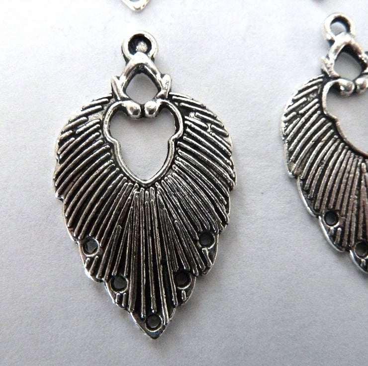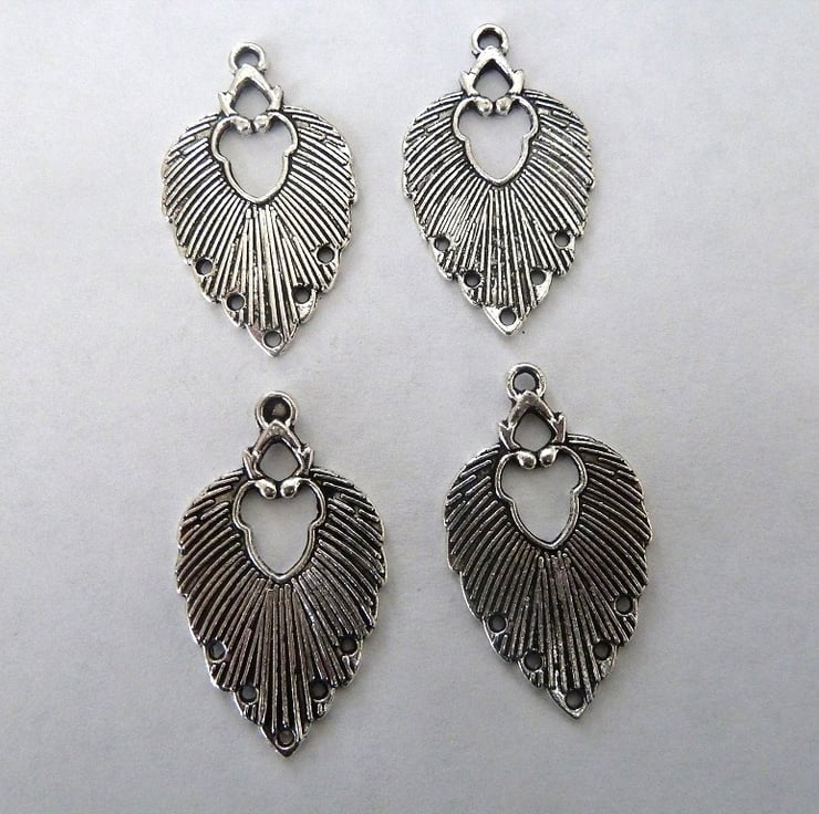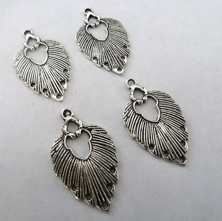 A pack of 4 antique silver leaf connectors, they have a loop on the top and 5 holes at the bottom.