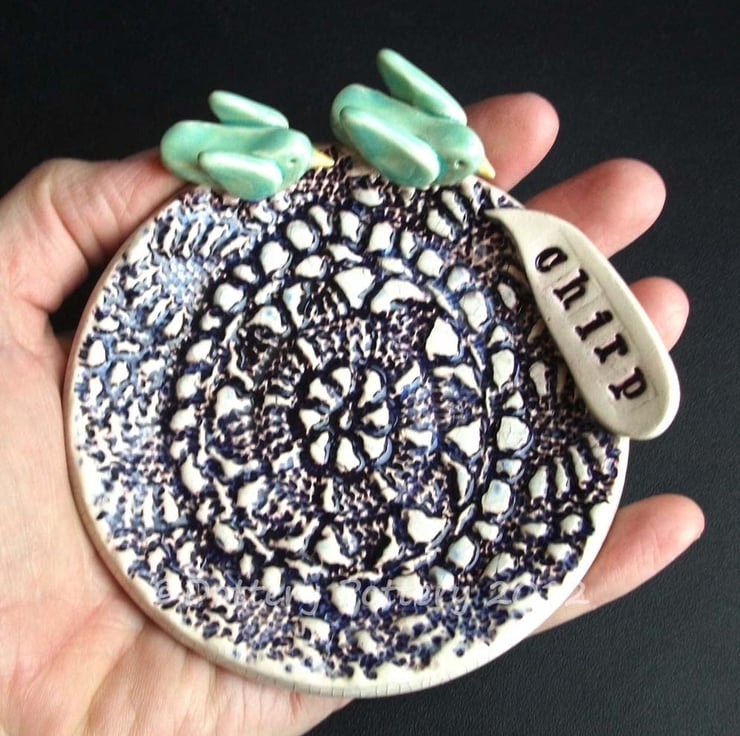This cute little dish is made from white earthenware clay and decorated with a little blue birds and a speech bubble with the word chirp.