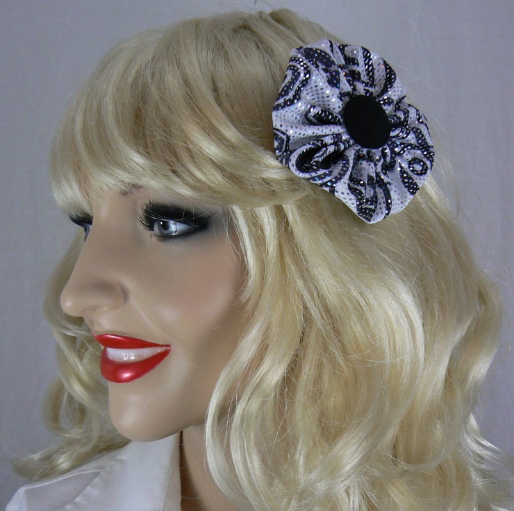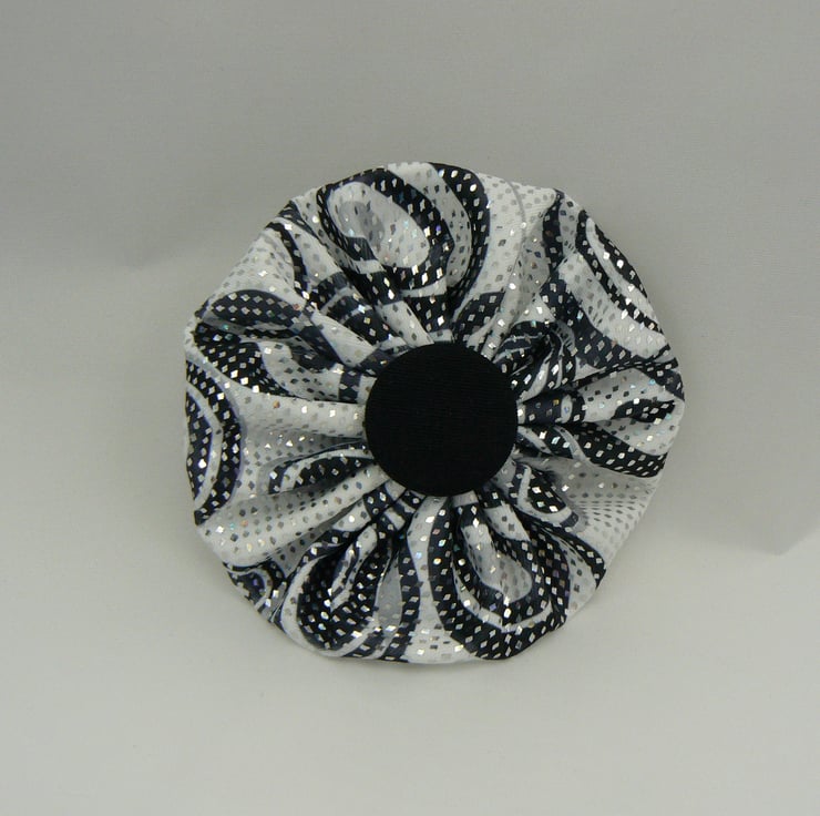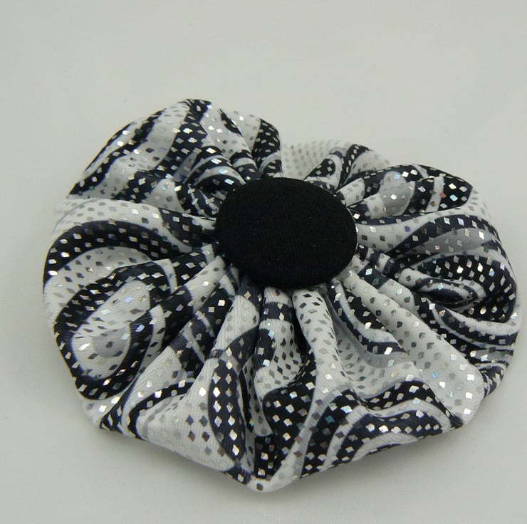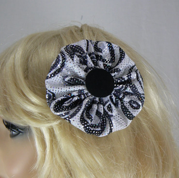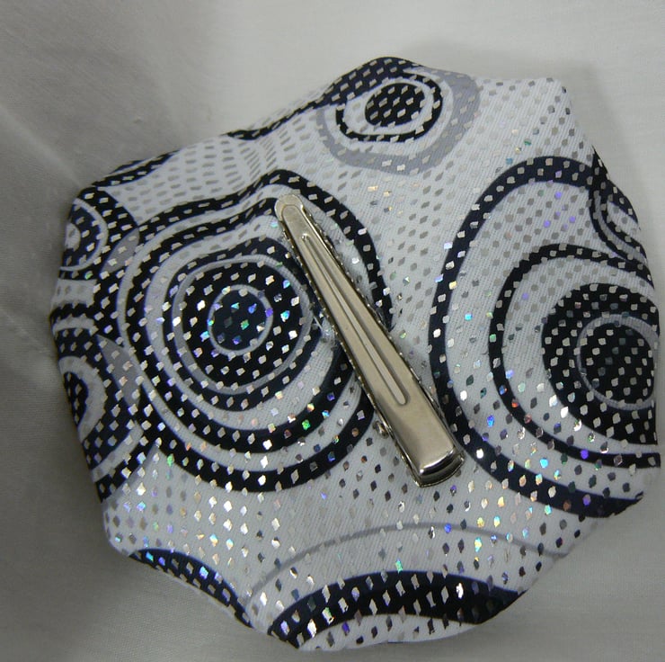 A sparkly black , white and silver yo yo hairclip measuring 3 1/2" in diameter with black button centre,with a crocodile clip on the back.
