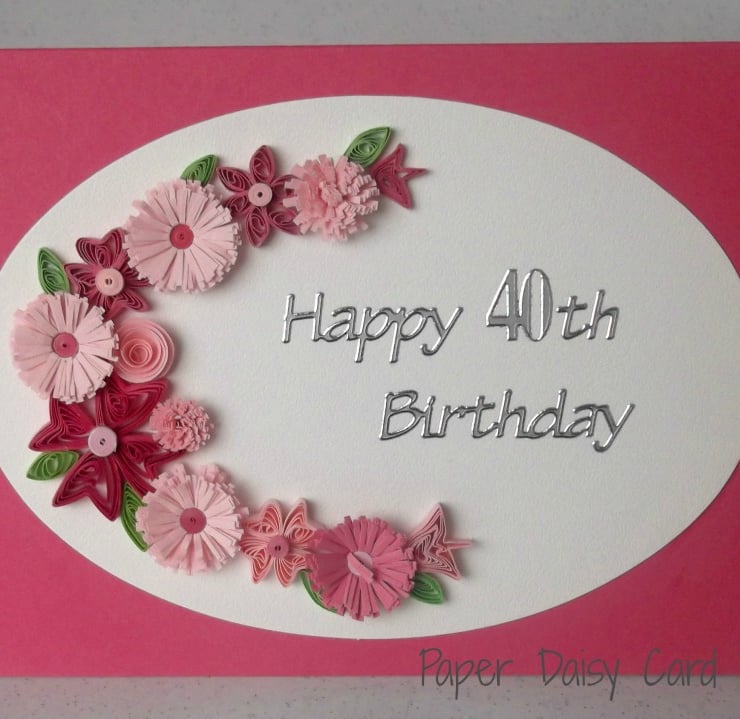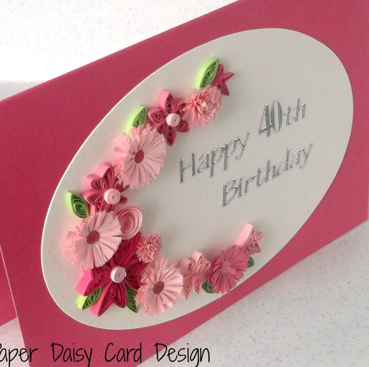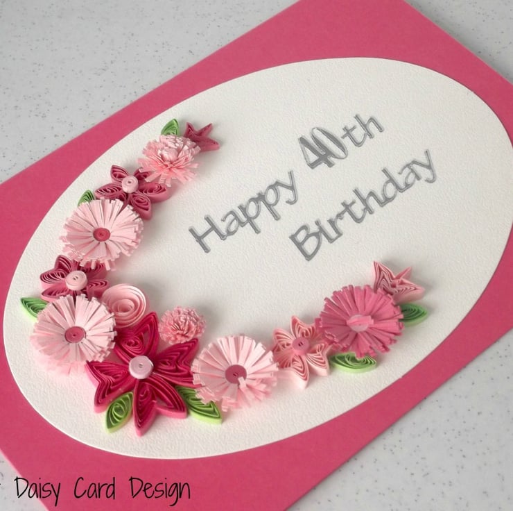 A beautiful quilled 40th birthday card with quilling flowers in coordinating shades of pink, perfect for helping that someone special celebrate a birthday.