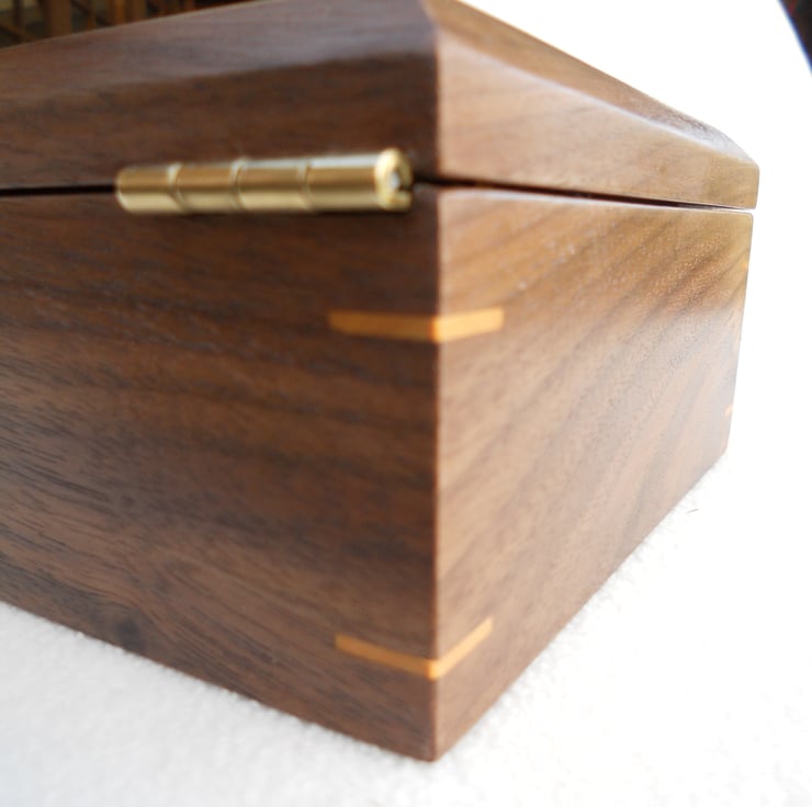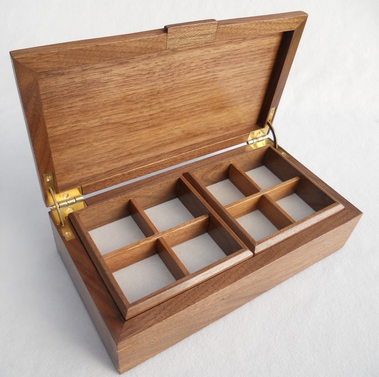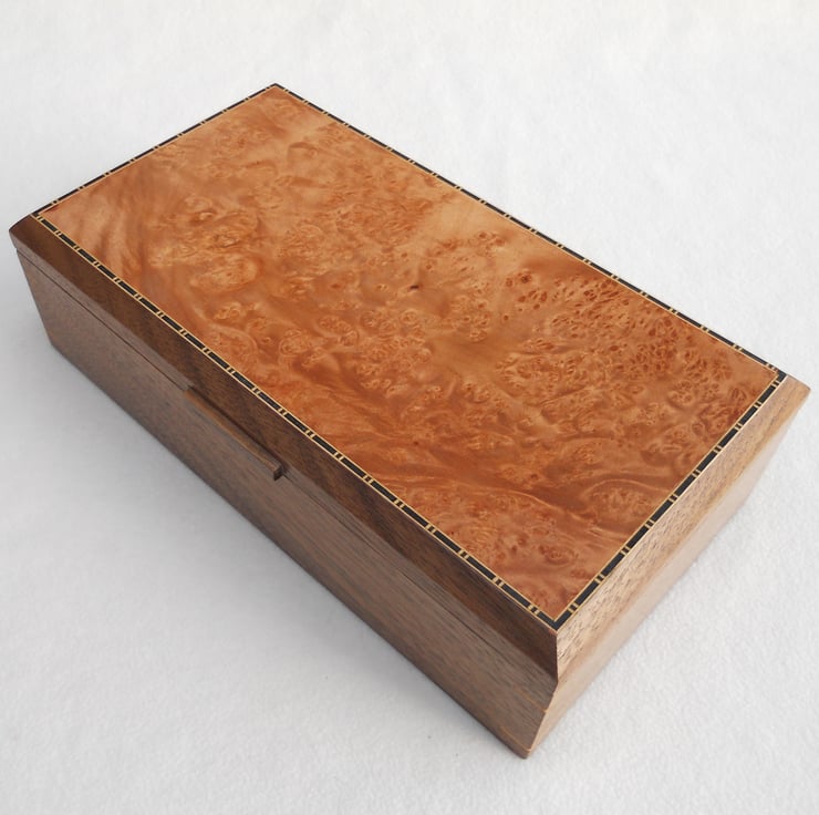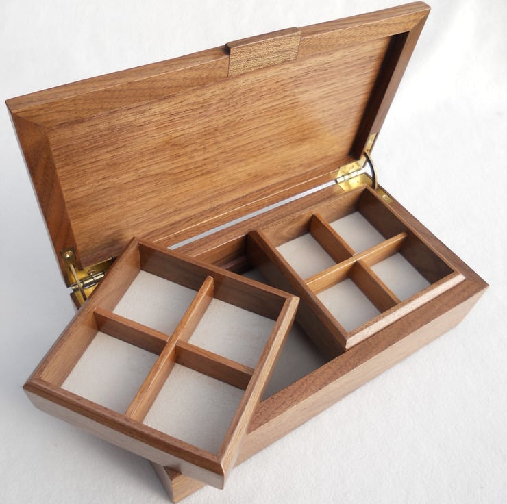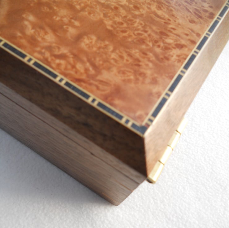 A Solid walnut jewellery box with a maple cluster burr veneered top inlaid with boxwood and black ,I have inserted pieces of boxwood at the corners as a feature and also to strengthen the mitres. There are 2 partitioned trays and along with the bottom are lined with a cream coloured suede/like material. The lid is hinged with quadrant hinges.