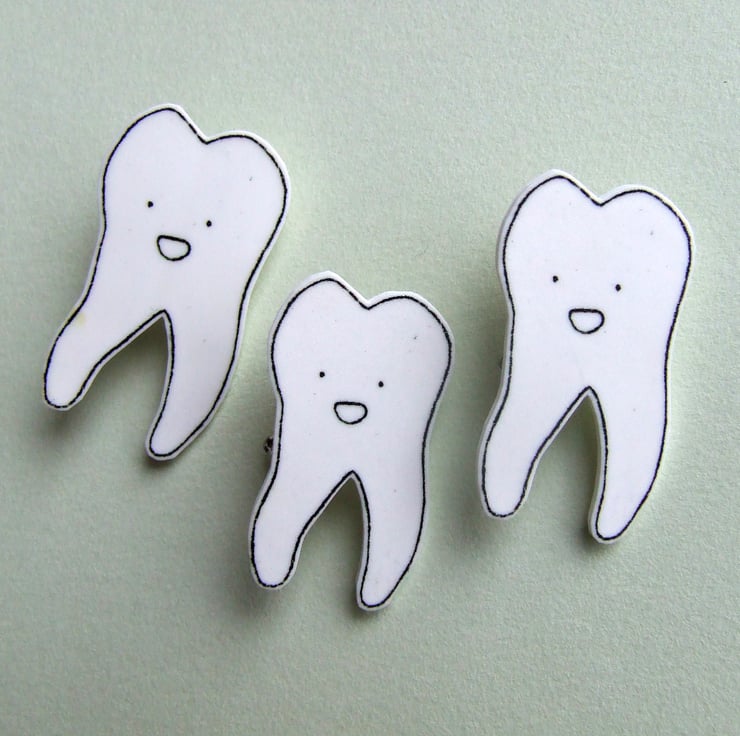 This listing is for one tooth badge only. It has been made by printing my original drawing on to shrink plastic. A little metal brooch fastening has been glued securely to the back. The badge is approximately 2cm wide and 3.5cm long - due to the nature of shrinking each badge size may vary slightly.