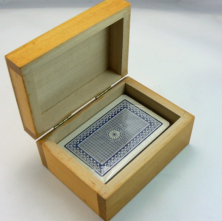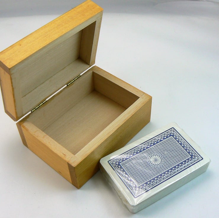 A playing card box (including playing cards) measuring 4 1/4"long x 3 1/4"deep x 2 1/4"High, with a hinged lid.