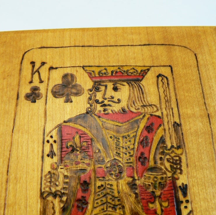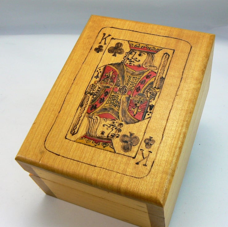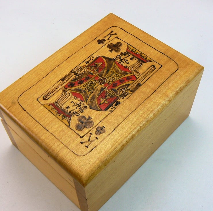 I have burnt in the intricate image of a playing card on this box using a technique called pyrography,and then used watercolour paints in red and yellow, followed by 2 coats of varnish to seal.