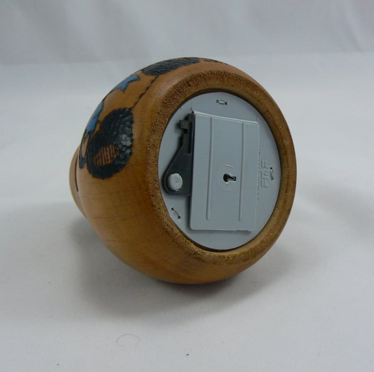 This little pear shaped money box with panda on stands 4 1/4"tall and 3"at widest point. I have burnt in the design and then added some colour, then given it three coats of danish oil to seal.